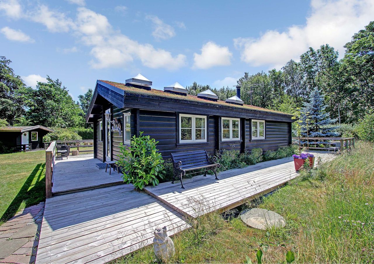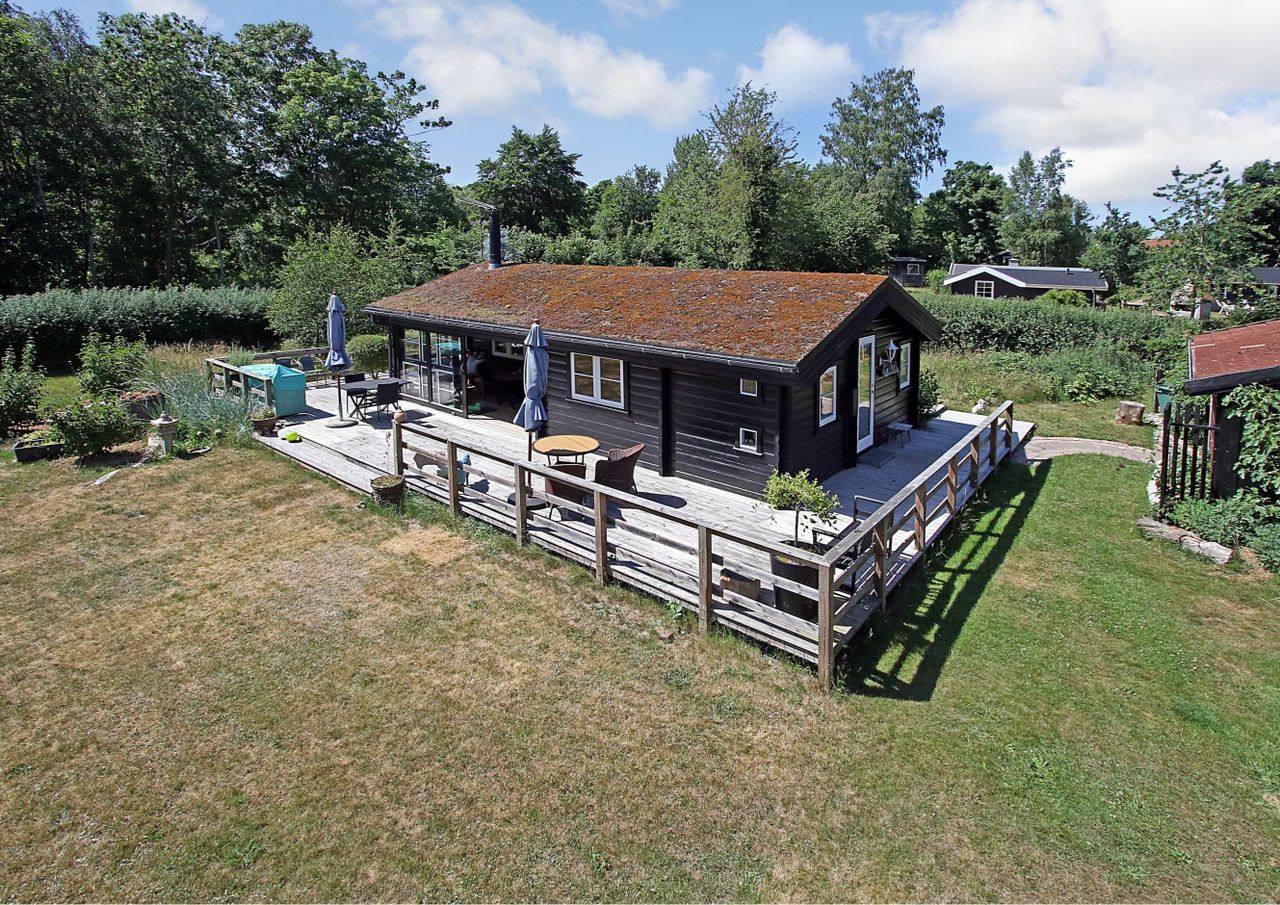 åben til stue med brændeovn og udgang til delvis lukket træterrasse. Huset har træterrasse hele vejen