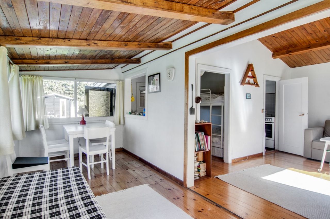 køkken, 2 dejlige lyse stuer samt et soveværelse. Der er brændeovn i den ene stue og udgang til haven