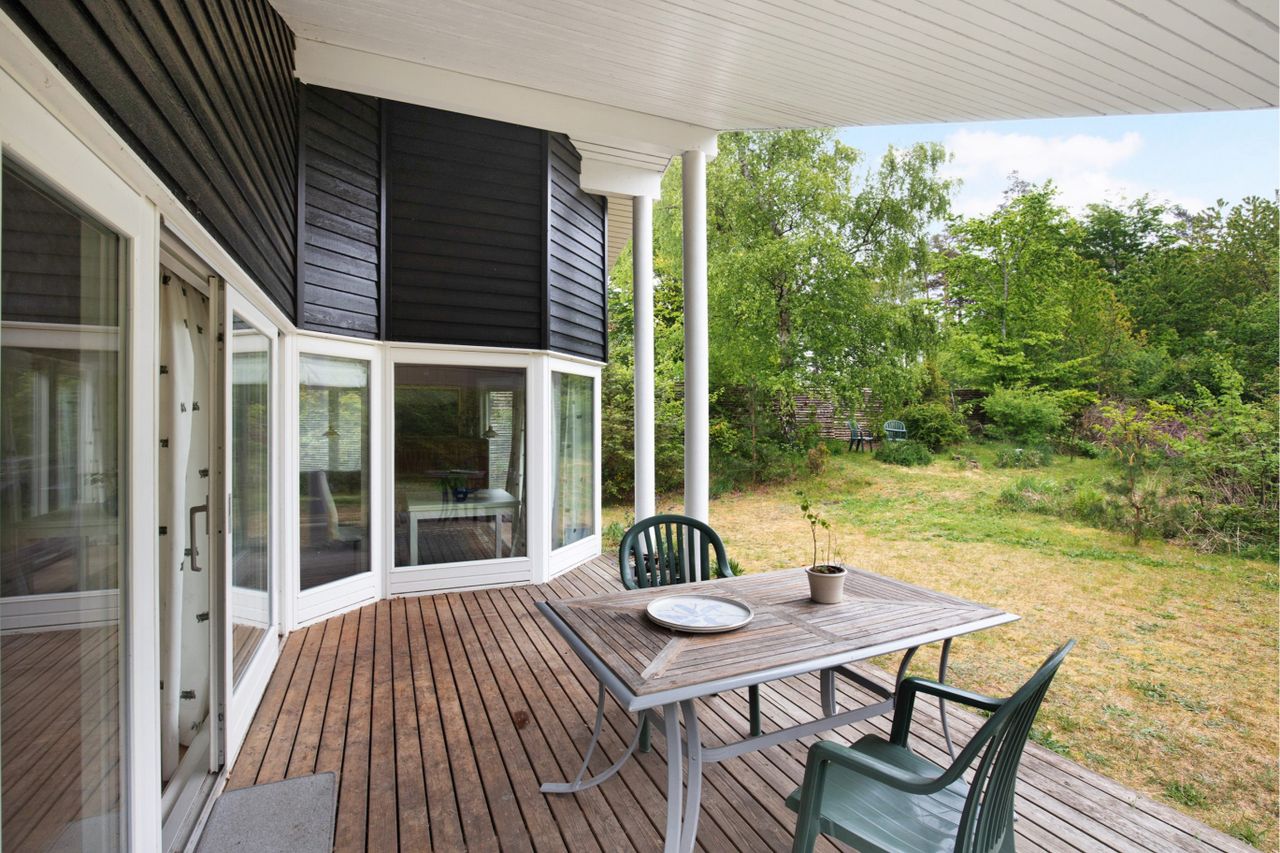 overdækket og sydvest vendt træ terrasse, med sol det meste af dagen. Huset har trægulve og loft til kip.