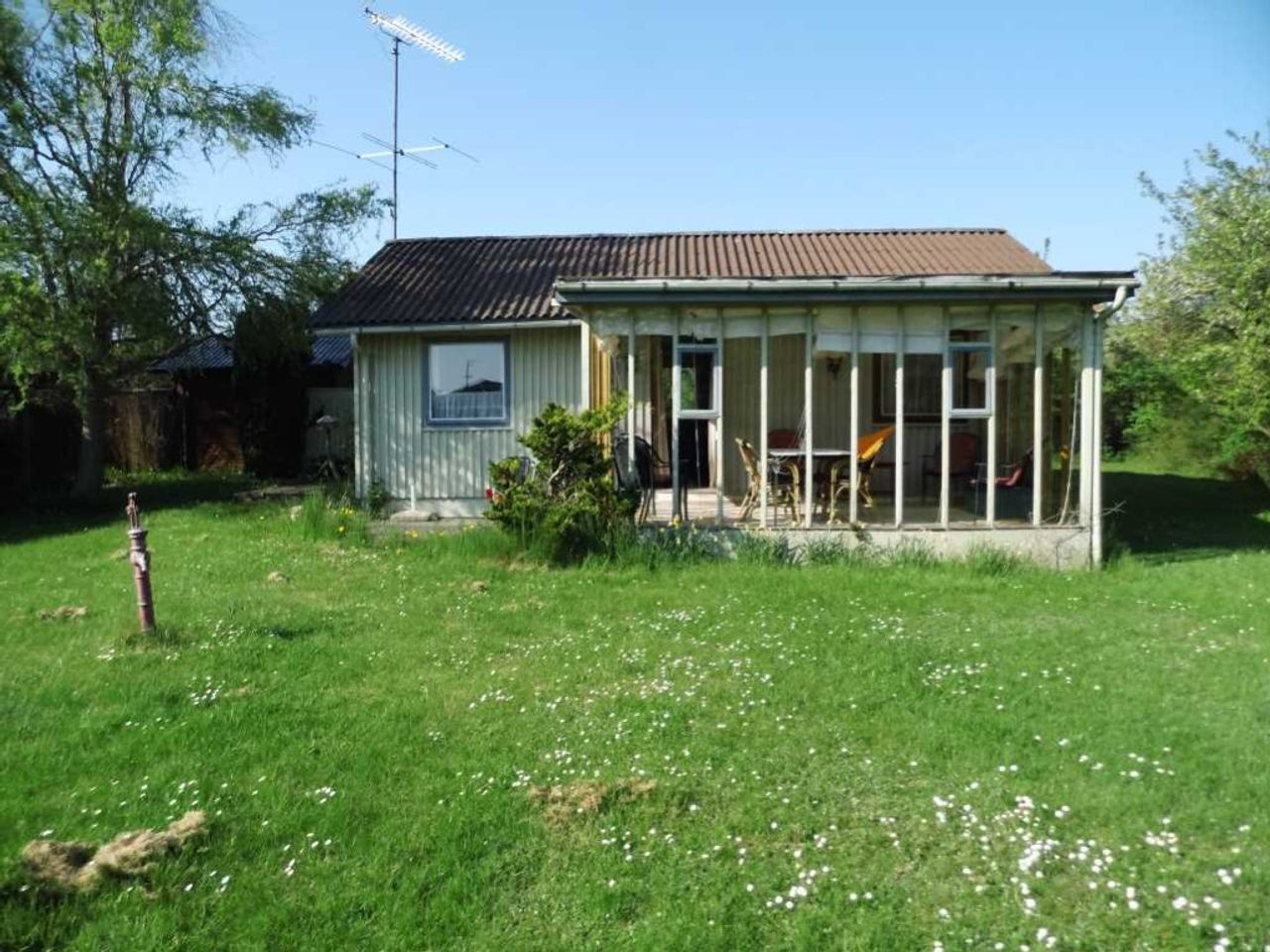 indkørsel er der carport og bag huset findes udhus. Grunden er udlagt med græs og meget nem at holde.
