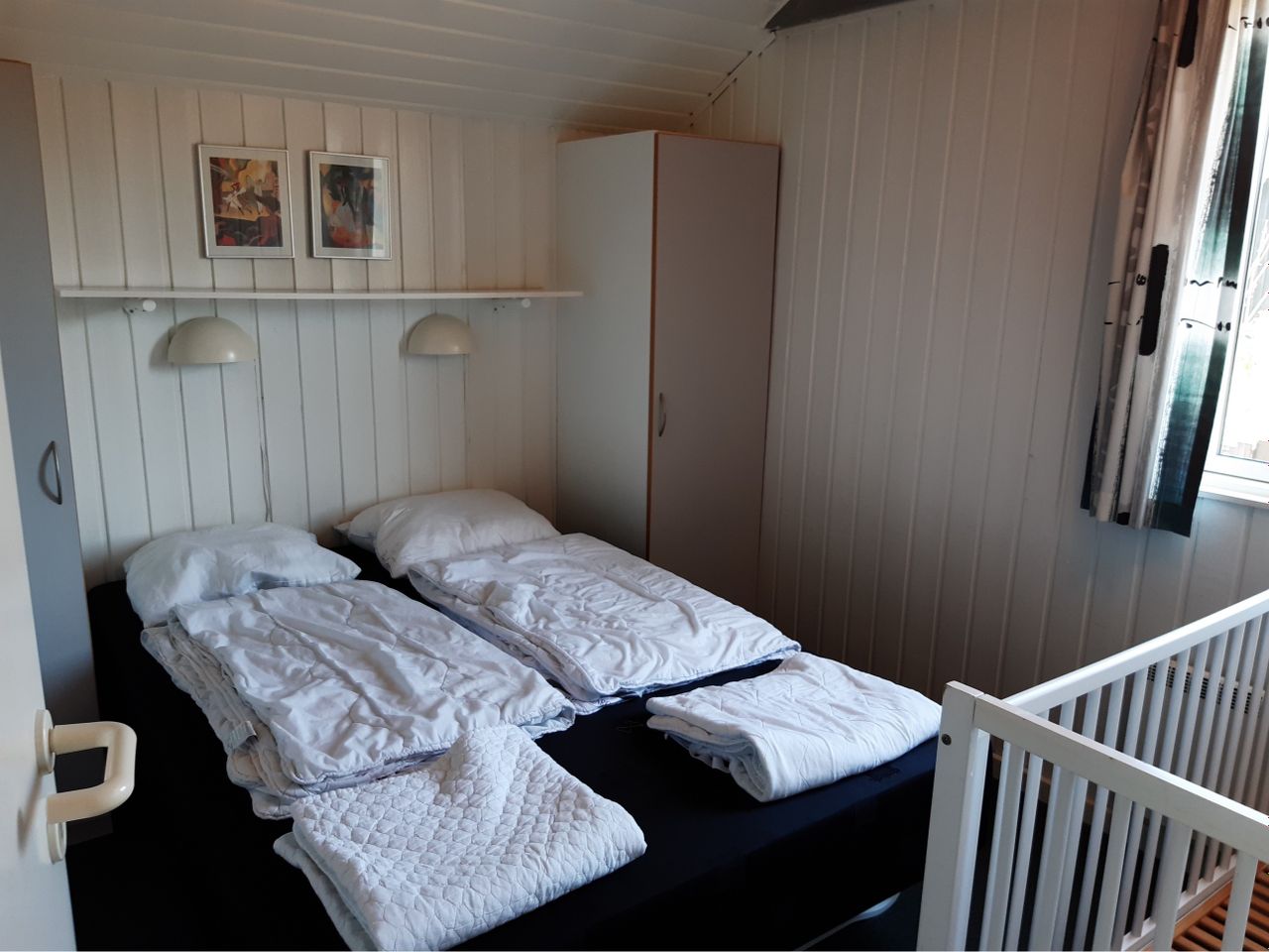 soveværelse med dobbeltseng, barneseng og skabsplads. Pænt badeværelset har bruseniche. Alt indbo