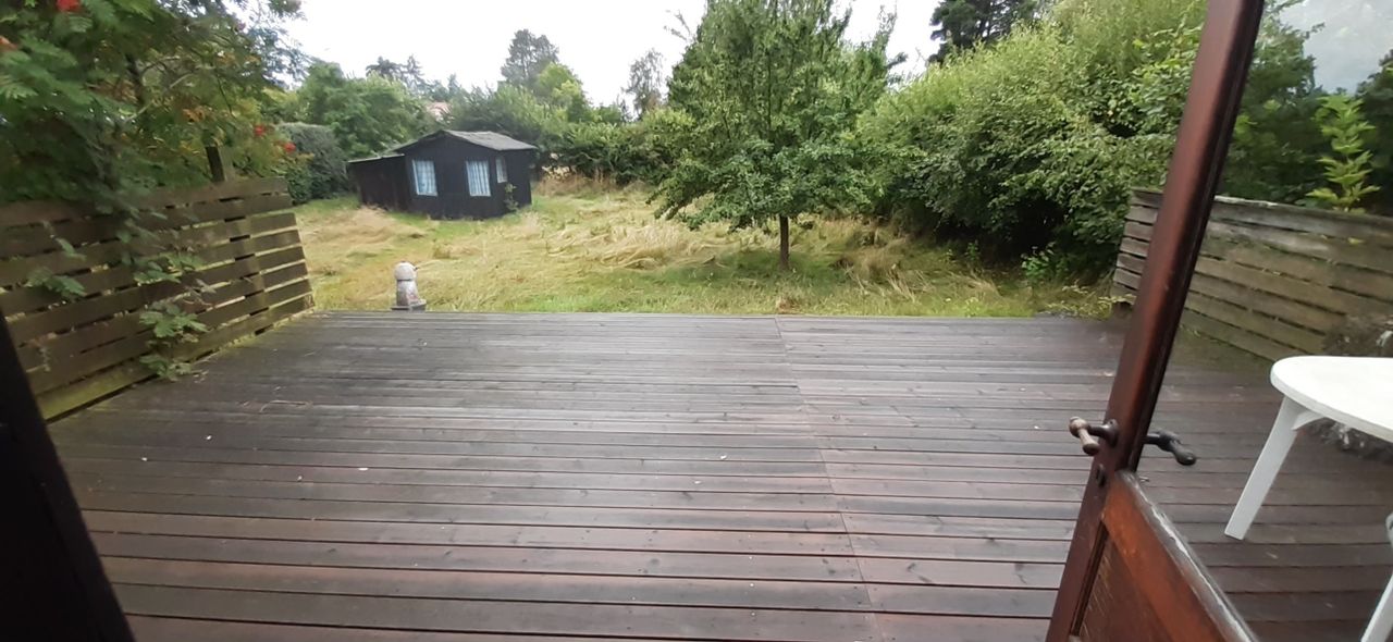 Fra stuen er der udgang til stor træterrasse og haven. For enden af grunden kan man via en lille sti gå