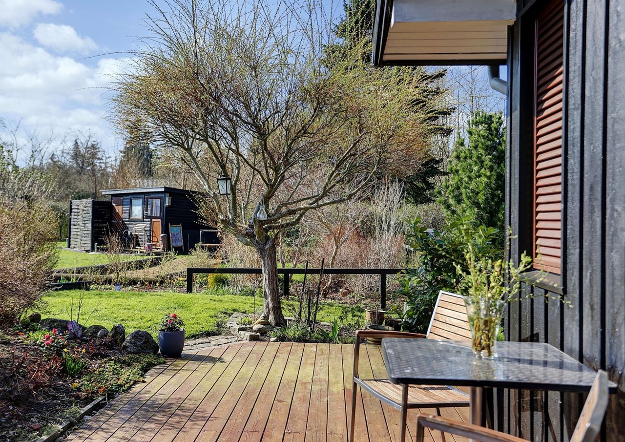 og udgang til dejlig stor solrig træterrasse, hvoraf en del er overdækket. I stuen er der også adgang til